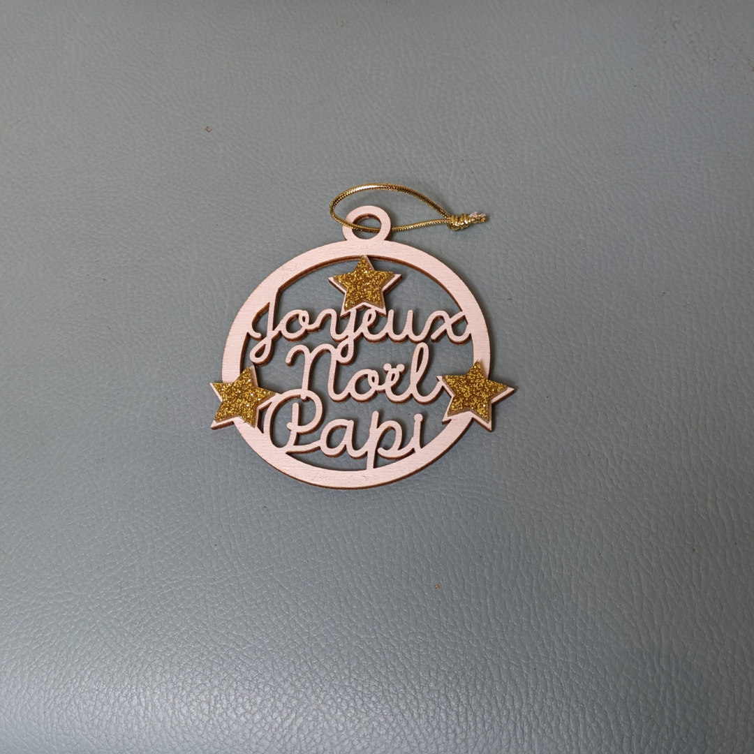 Personnalisez votre décoration de Noël avec nos Boules de Noël “Joyeux Noël”. Ajoutez une touche originale à votre sapin avec nos options d’inscription personnalisée : joyeux noël maman, joyeux noël mamie, joyeux noël marraine, joyeux noël papa, joyeux noël papi, joyeux noël parrain, joyeux noël tonton. Nos boules sont en contreplaqué de peuplier de 3mm d’épaisseur avec un décor en PMMA ou plexi de 3mm d’épaisseur, et un cordon en fil métallique et PP ou cordon PE pour l’attacher facilement au sapin. Veuillez noter que comme le bois est une matière naturelle, des différences de teintes peuvent être présentes sur une même boule ou entre deux boules. Les dimensions hors décor sont d’environ 10,5 cm de hauteur et 9 cm de largeur. Nos boules de Noël ne sont pas des jouets et doivent être manipulées par les enfants sous surveillance. Découvrez également notre collection édition limitée Noël, comprenant nos boules de Noël personnalisables, nos cartes étapes d’édition limitée de Noël, ainsi que notre calendrier de l’avent.