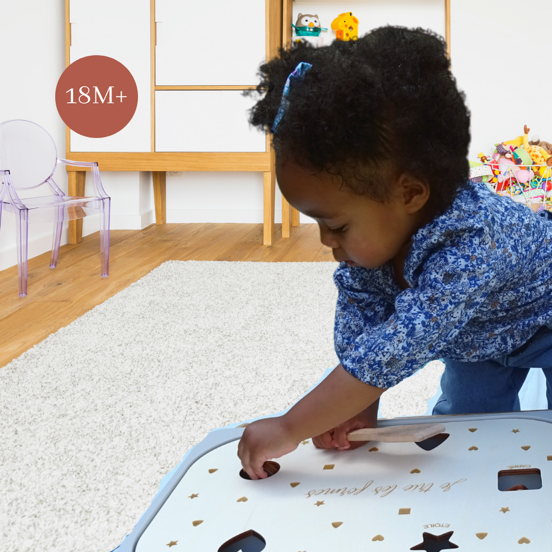 En autonomie ou avec votre aide, votre enfant, dès 18 mois saura différencier et reconnaître les formes en deux-temps trois mouvements grâce à notre superbe couvercle éducatif en contreplaqué de peuplier, adapté aux grands bacs IKEA Trofast, à utiliser également avec la table Flisat!