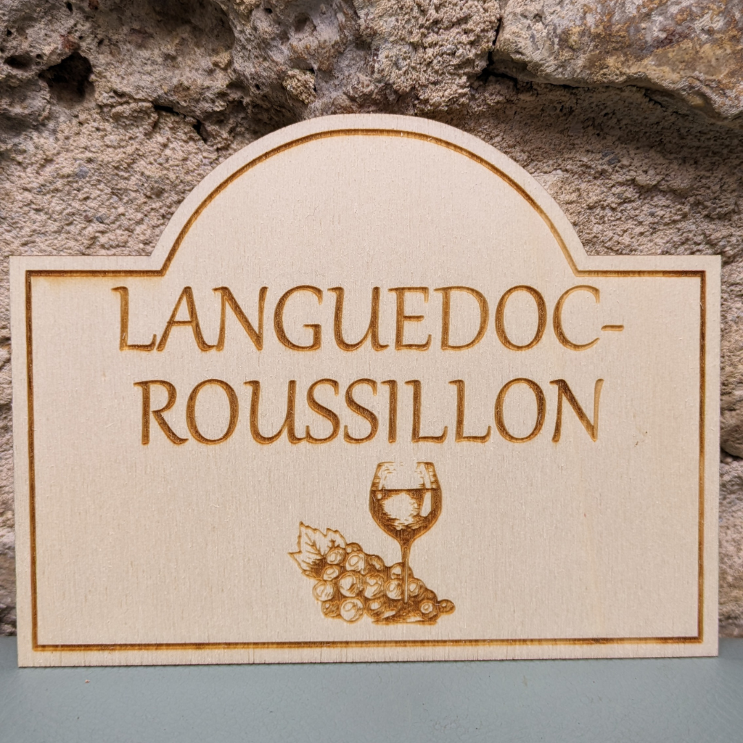 Pancarte de cave en contreplaqué de peuplier “Languedoc-Roussillon”.