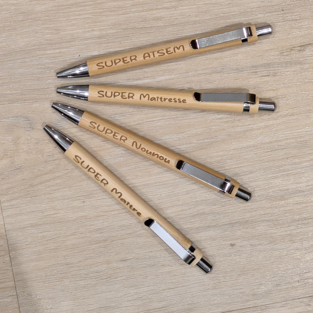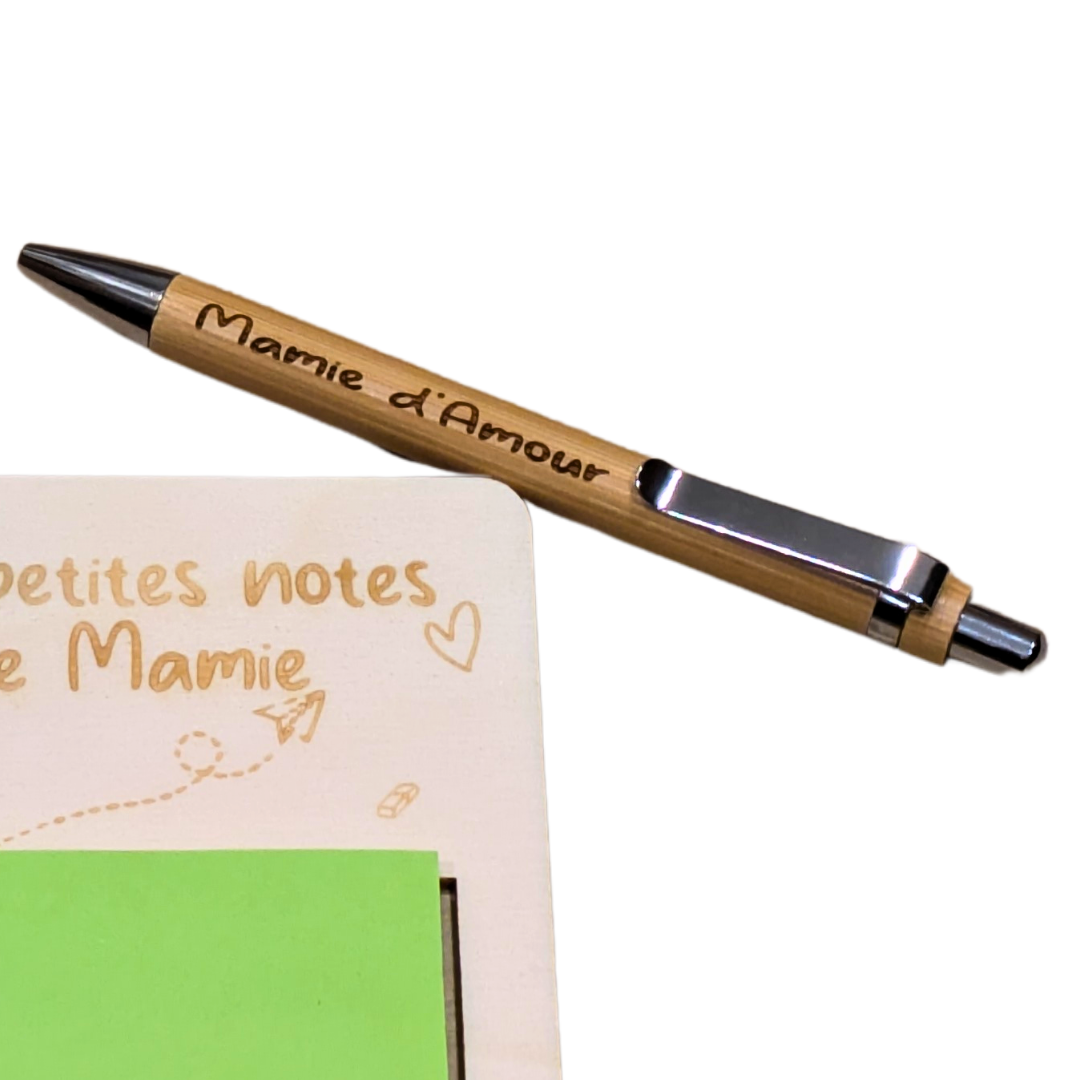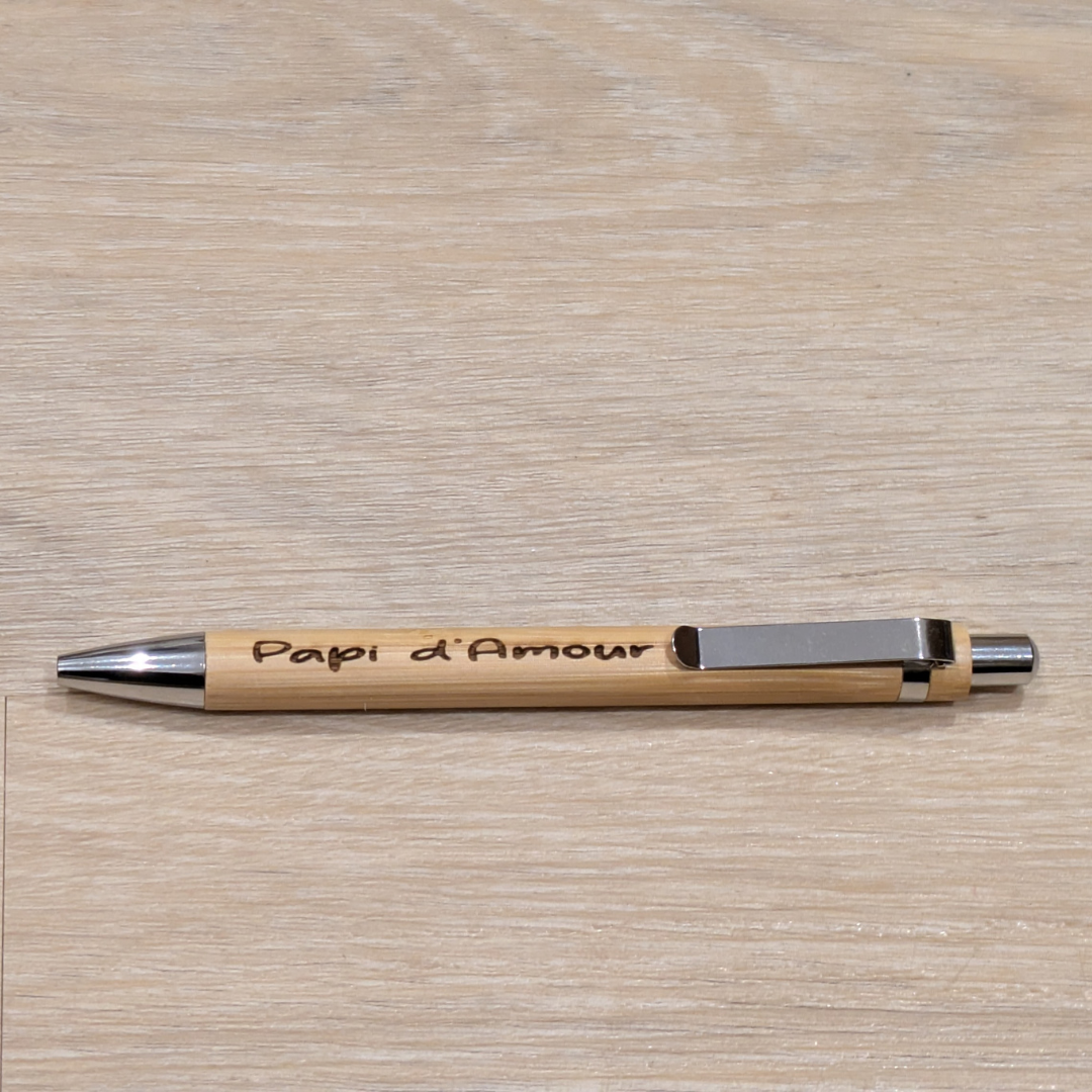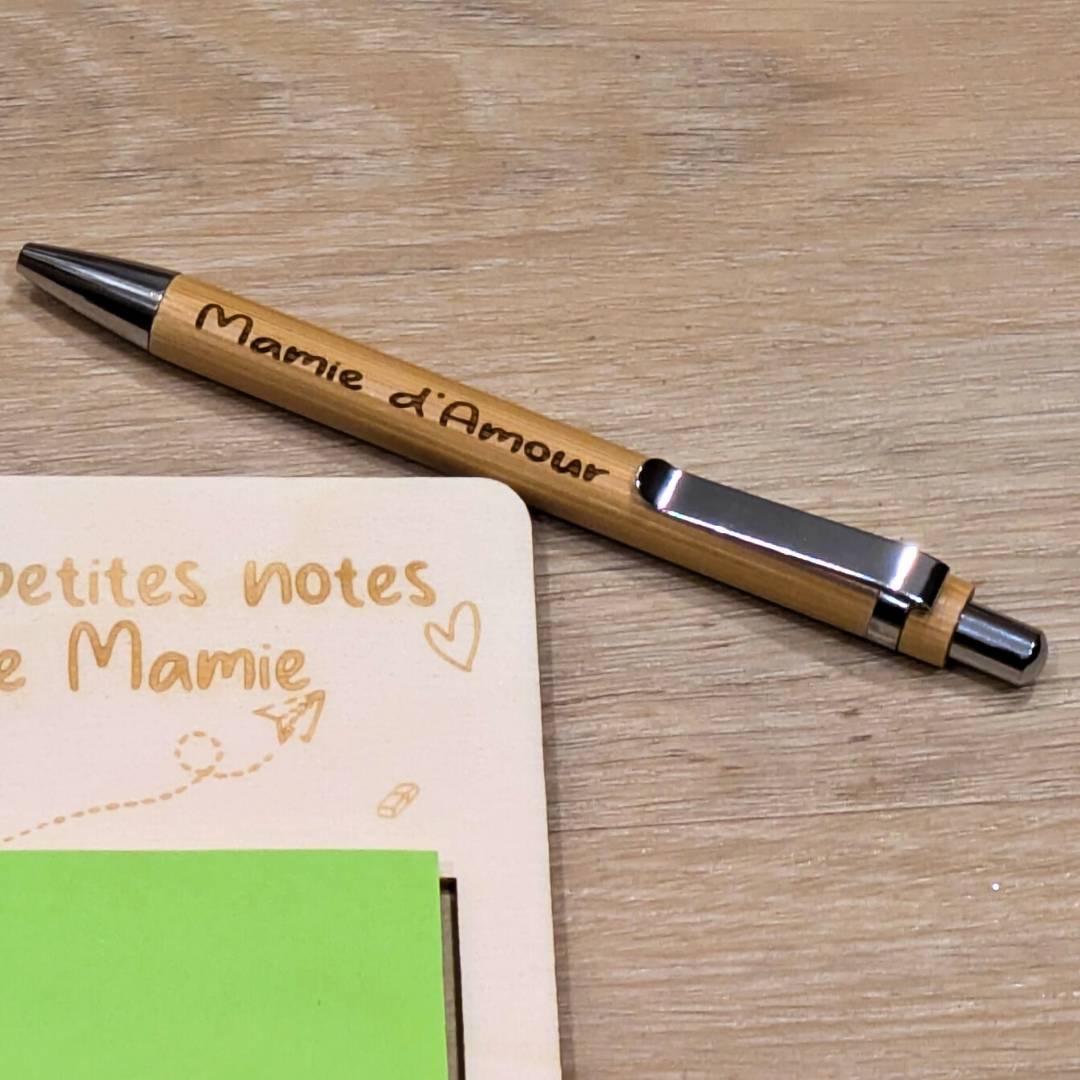 Offrez un cadeau à la fois élégant et plein de tendresse avec notre stylo à bille en bambou gravé. Personnalisé avec le message de votre choix, il est parfait pour exprimer votre amour et votre gratitude à l’occasion de la fête des Mamies, des Papis ou encore pour la fin de l’année scolaire.